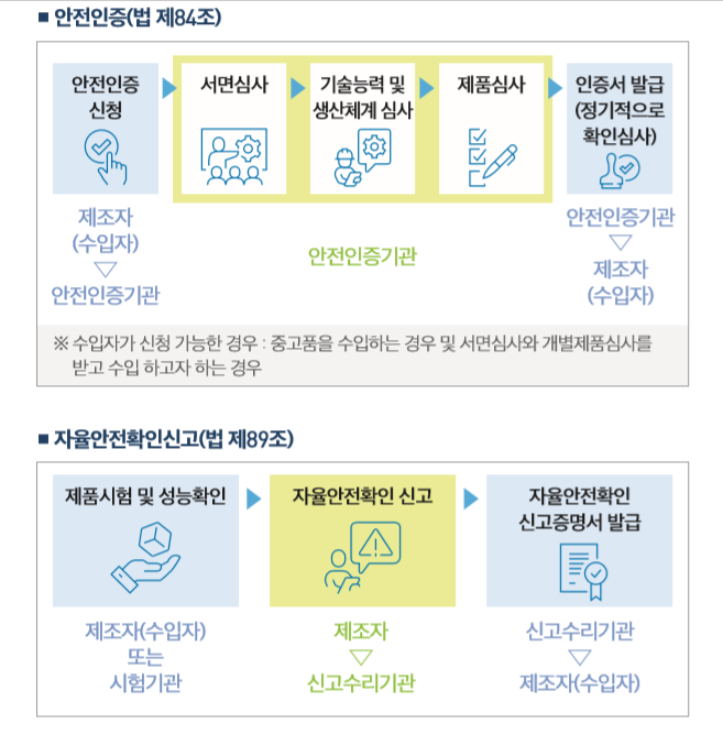 - 안전인증 : 안전인증대상 기계등의 안전성능, 제조자 기술능력, 생산체계 등을 안전인증 기준에 맞는지 고용노동부장관이 종합적으로 심사